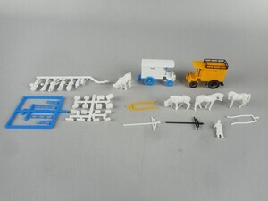 Modell-Bausatz für 2 Lieferwagen (Pferdefuhrwerke) in Baugröße H0, Maßstab 1:87 der Firma Preiser. 1 Postpaketwagen, 1 Lieferwagen. Dazu Pferde, Kutscher, Figuren.