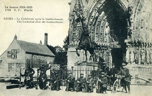 Auf der Vorderseite: Fotografie zweier Kinder in zerstörtem Zimmer. Bildunterschrift: "Les Zeppelins sur Paris - Crimes odieux des pirates boches / Deux enfants échappés à la mort" [Die Zeppeline über Paris - abscheuliche Verbrechen der deutschen Piraten / Zwei dem Tod entkommene Kinder], Verlag: "Imp. E. Le Deley, Paris". Die Rückseite ist unbeschriftet.