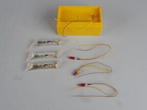 Karton mit Inhalt: 3x Seuthe Dampfdestillat, 4 Glühlampen mit Drahtanschluss, 1 Batteriekasten (?).