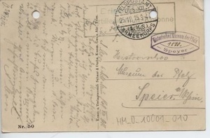 Die propagandistische Postkarte aus der Zeit des Ersten Weltkriegs zeigt ein Munitionspäckchen und einzelne Patronen des Typs "Dum-Dum", die (laut Kartentext auf der Vorderseite) angeblich bei französischen Kriegsgefangenen gefunden wurden, obwohl deren Einsatz damals bereits völkerrechtswidrig war. In dem speziellen Fall handelt es sich um angebohrte Patronen (so genannte Hohlspitzgeschosse), häufig bezeichnen Dum-Dum-Geschosse auch Teilmantelgeschosse, bei denen der Bleikern an der Spitze freiliegt. Die umgangssprachliche Bezeichnung bezieht sich auf die indische Stadt Dum Dum bei Kalkutta, wo im späten 19. Jh. erstmals derartige Munition hergestellt wurde. Teilmantelgeschosse deformieren sich beim Auftreffen auf ein weiches Ziel und fügen dem Opfer weitaus größeren Schaden zu als Vollmantelgeschosse. Aus diesem Grund wurden Dum-Dum-Geschosse bereits 1907 in Artikel 23 der Haager Landkriegsordnung verboten. Im Ersten Weltkrieg beschuldigten sich die verschiedenen Kriegsparteien dennoch gegenseitig der Verwendung solcher Munition. Die Verwendung von Dum-Dum-Geschossen ging jedoch wohl nicht auf offizielle Anordnungen zurück, sondern auf Initiativen einzelner Soldaten, die ihrem Feind besonders schwere Verletzungen zufügen wollten. Die Patronen konnten für diese Zwecke durch Anbohren oder Abschleifen recht einfach händisch manipuliert werden. Die Karte erschien bei der Kunst- und Verlagsanstalt Schaar & Dathe, Komm.-Ges. a. Akt, Trier. Der Verlag war 1895 von Aloys Schaar und Hermann Dathe gegründet worden und entwickelte sich im frühen 20. Jh. zu einem der größten deutschen Postkartenverlage. Er gab insbesondere Feldpostkarten heraus und schickte seine Fotografen für propagandistisch nutzbare Aufnahmen an die Front. In der handschriftlichen Nachricht auf der Rückseite der Karte bedankt sich der Schreiber beim Historischen Museum der Pfalz für den Erhalt der "Urgeschichte der Pfalz". Dabei handelt es sich offensichtlich um eine Publikation des Museums aus dem Jahr 1915, die auch durch die vorgeschichtliche Abteilung des Museums führt. [Johanna Kätzel]