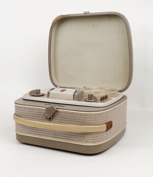 Ein tragbares Tonbandkoffergerät von Grundig, dass in den Jahren1959 bis 1962 hergestellt wurde. Das Tonband ist für die 4 Spurtechnik ausgelegt und kann Spulen bis 15 cm Durchmesser bedienen. Die Bandgeschwindigkeit beträgt 9, 5 cm/s und ist nicht veränderbar. Externe Anschlüsse für Micro, Radio, Plattenspieler sind vorhanden. Die Bezeichungen aller Bedienelemente sind lediglich auf eine durchsichtige Folie aufgedruckt, was nicht unbedingt der Haltbarkeit dienlich ist. Der Interne Lautsprecher ist abschaltbar. Der Kaufpreis lag 1959 bei 435 DM Als Zubehör hat sich der frühere Besitzer, das Original Grundig Microfon mit gekauft. Verstaut ist es, zusammen mit dem Stromkabel in einem separaten Fach auf der Unterseite.