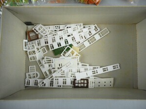Vollmer 3777 "Stadthaus mit Atelier" Karton mit Inhalt: Bögen mit Fensterhintergründen von Modellhäusern, Beutel mit Streuflocken, Reklametafeln Baugröße H0, Maßstab 1:87