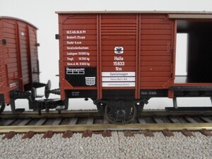 Fleischmann H0 5833 2 Stück 2 Achsiger gedeckter Güterwagen der Königlich Preußischen Eisenbahn-Verwaltung, Gattung Nm. Verbandsbauart (1910 - 1924 nach Plänen des Deutschen Staatsbahnwagen-Verbandes gebaut) Wagenaufbau rotbraun mit weißer Beschriftung, Dach hellbraun, Fahrgestell schwarz mit weißer Beschriftung. Bewegliche Schiebetüren. Betriebsnummer "Halle 15833". Ausgestattet mit Speichenrädern, beidseitig "Fleischmann Profi-Kupplung" (Kurz-Kupplung). In originaler Kunststoff-Verpackung. Fleischmann Hakenkupplungen beiliegend. Nenngröße H0 (Maßstab 1:87), 2-Leiter Gleichstrom-System Epoche 1 (Länderbahn-Zeit 1835 - 1920)