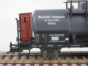 Fleischmann 5847 K 2-achsiger Kesselwagen "Mineralöltransporte der Firma A. May, Erfurt", mit Bremserhaus. Betriebsnummer "Erfurt 50 2231" Kessel dunkelgrau mit weißer Beschriftung, Bremserhaus rotbraun, Fahrgestell schwarz mit weißer Beschriftung. Kurzkupplungs-Kinematik, beidseitig "Fleischmann Profi--Kupplung"(Kurzkupplung). Speichenräder. Baugröße H0 (Maßstab 1:87) 2-Leiter Gleichstrom-System (isolierte Achsen) Epoche 1-2 ( Übergang Länderbahn zu Staatsbahn-Zeit um 1920)