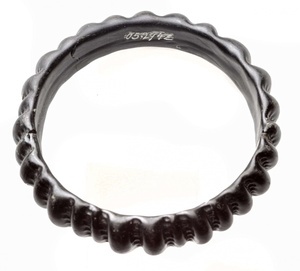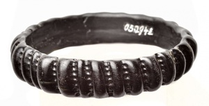 Aus einem Frauengrab stammt dieser stark gegliederte, gläserne Armreif, der wohl in einer örtlichen Werkstatt hergestellt wurde. Schwarz war im 3. und 4. Jahrhundert die vorherrschende Farbe für Schmuckgegenstände.