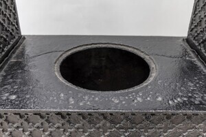 Eisenguss geschwärzt. Zirkulierofen auf vier schmalen hohen, geschwungenen Füßen aus der Produktion der Weilerbacher Hütte bei Bollendorf. Flächig mit gotischem Vierpassdekor versehen.