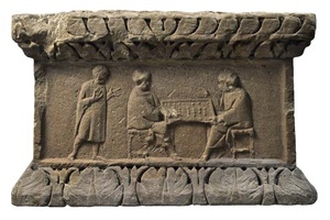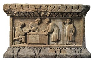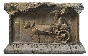 Die Vorderseite dieses Reliefblocks von einem Grabdenkmal zeigt einen Reisenden auf einem einachsigen Kastenwagen sowie einen Meilenstein, der vor dem Gespann zu sehen ist. Auch die anstoßenden Seiten zeigen Motive aus dem Alltagsleben. In einem Kontor finden Zahlungen statt. Umstritten ist die Szene auf der dritten Seite: Zwei Männer sitzen vor einem Brett, auf dem in Reihen Kugeln liegen. Es handelt sich entweder um zwei Spieler mit einem Spielbrett oder um zwei Männer, die mit einem Abacus rechnen.