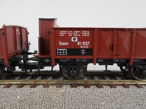 Fleischmann H0 5842 K 3 Stück 2-Achsiger kurzer offener Güterwagen, eiserne Bauart mit Bremserhaus, mit mittelhohen Bordwänden der Königlich Preußischen Eisenbahn-Verwaltung, Gattung Omk (u). Verbandsbauart (1910 - 1924 nach Plänen des Deutschen Staatsbahnwagen-Verbandes gebaut). In großer Stückzahl zum Transport von Kohle beschafft. Wagenaufbau rotbraun mit weißer Beschriftung, Fahrgestell schwarz mit weißer Beschriftung. Betriebsnummer "Essen 81 637". Ausgestattet mit Speichenrädern, Kurzkupplungs-Kinematik und beidseitig "Fleischmann Profi-Kupplung" (Kurz-Kupplung). In originaler Kunststoff-Verpackung. Fleischmann Hakenkupplungen beiliegend. Nenngröße H0 (Maßstab 1:87), 2-Leiter Gleichstrom-System Epoche 1 (Länderbahn-Zeit 1835 - 1920)