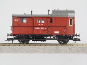 Fleischmann 5840 K 2-achsiger kurzer Gepäckwagen, als Güterzug-Begleitwagen verwendet, der Preußischen Staats-Eisenbahn Verwaltung, Gattung Pg. Betriebsnummer "Frankfurt 5171" Die preußische Bauart, später als "Pwg Pr 14" bezeichnet, wurde von 1913 bis 1925 in 9752 Exemplaren gebaut. Wagenkasten braun mit weißer Beschriftung, Dach grau mit Zugführer-Kanzel, Fahrgestell schwarz mit weißer Beschriftung und durchgehenden Trittbrettern. 2 bewegliche Schiebetüren. Kurzkupplungs-Kinematik, beidseitig "Fleischmann Profi--Kupplung"(Kurzkupplung). Speichenräder. Baugröße H0 (Maßstab 1:87) 2-Leiter Gleichstrom-System (isolierte Achsen) Epoche 1-2 ( Übergang Länderbahn zu Staatsbahn-Zeit um 1920)