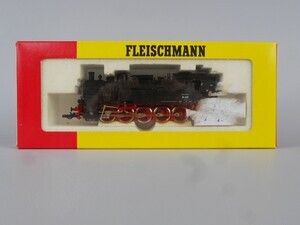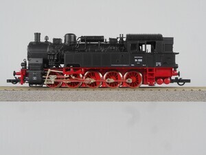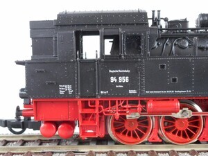Fleischmann 4093 Heißdampf-Tender-Dampflok Baureihe 94 der Deutschen Reichsbahn-Gesellschaft. Preußische Bauart (T 16), gebaut 1905 - 1923. Betriebs-Nr. 94 956 Tender-Dampflok mit 5 Kuppelachsen (Bauart E h2). Kessel, Führerhaus und Tenderaufbau schwarz, Räder und Fahrgestell rot. Beschriftung weiß. Antrieb im Führerhaus, 5 Achsen angetrieben. Gehäuse aus Kunststoff. Je 2 beleuchtete Stirnlampen beidseitig. Radkränze und Gestänge vernickeltes Metall. Beidseitig "Roco Kurzkupplung". Original-Verpackung aus Karton mit Kunststoff-Einsatz. 2-Leiter Gleichstrom-System analog. Epoche 2 (Staatsbahn-Zeit (1920-1945)