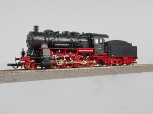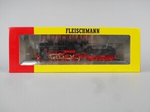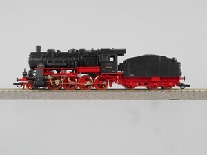 Fleischmann 4156 Güterzug-Dampflok Baureihe 56 der Deutschen Reichsbahn-Gesellschaft. Preußische Bauart (G 8.2). Betriebs-Nr. 56 2048 Schlepptender-Dampflok mit 4 Kuppelachsen, 1 Vorlaufachse und 3-achsigem Tender. Kessel, Führerhaus und Tenderaufbau schwarz, Räder und Fahrgestell rot. Beschriftung weiß. Antrieb im Tender, 3 Achsen angetrieben. Gehäuse aus Kunststoff. Je 2 beleuchtete Stirnlampen an Lok und Tender. Radkränze und Gestänge vernickeltes Metall. Beidseitig "Roco Kurzkupplung". Original-Verpackung aus Karton mit Kunststoff-Einsatz. Beiligend Anleitung. 2-Leiter Gleichstrom-System analog. Epoche 2 (Staatsbahn-Zeit 1920-1945)