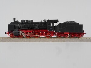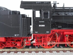 Fleischmann 4160 Personenzug-Dampflok Baureihe 38 der Deutschen Reichsbahn-Gesellschaft. Preußische Bauart (P 8). Betriebs-Nr. 38 2609 Schlepptender-Dampflok mit 3 Kuppelachsen, 2 Vorlaufachsen und 4-achsigem Tender. Kessel, Führerhaus und Tenderaufbau schwarz, Räder und Fahrgestell rot. Beschriftung weiß. Antrieb im Tender, 3 Achsen angetrieben. Gehäuse aus Kunststoff. Je 2 beleuchtete Stirnlampen an Lok und Tender. Radkränze und Gestänge vernickeltes Metall. Keine Kupplung. Original-Verpackung aus Karton mit Kunststoff-Einsatz. 2-Leiter Gleichstrom-System analog. Epoche 2 (Staatsbahn-Zeit 1920-1945)