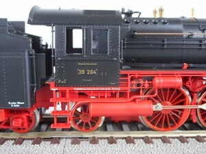 Fleischmann 4139 Personenzug-Dampflok Baureihe 39 der Deutschen Reichsbahn-Gesellschaft. Preußische Bauart (P 10). Betriebs-Nr. 39 204 Schlepptender-Dampflok mit 4 Kuppelachsen, 1 Vorlaufachse und 1 Nachlaufachse sowie 4-achsigem Tender. Kessel, Führerhaus und Tenderaufbau schwarz, Räder und Fahrgestell rot. Beschriftung weiß. Antrieb im Tender, 3 Achsen angetrieben. Gehäuse aus Kunststoff. Je 2 beleuchtete Stirnlampen an Lok und Tender. Radkränze und Gestänge vernickeltes Metall. Keine Kupplung. Original-Verpackung aus Karton mit Kunststoff-Einsatz. 2-Leiter Gleichstrom-System analog. Epoche 2 (Staatsbahn-Zeit 1920-1945)