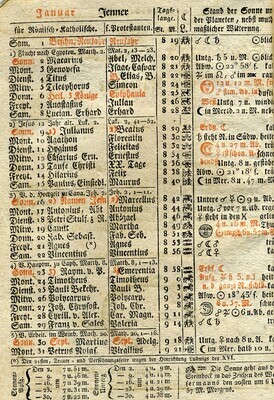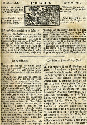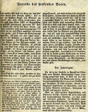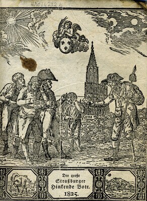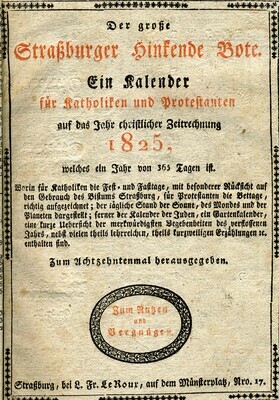 Kalender und Almanache waren bis zum 19. Jh. ein populäres Lektüremedium für breite Bevölkerungsschichten. In Straßburg wurden sogar mehrere dieser Kalender verlegt. Der große Straßburger Hinkende Bote erschien bei Le Roux. Wie einige andere Verleger in frankophonen Gebieten gab Le Roux mit dem Grand Messager boitteux de Strasbourg auch eine französische Ausgabe des Kalenders mit identischen, lediglich übersetzten Inhalten heraus. Wie für die Gattung der Volkskalender üblich, enthält der Große Straßburger Hinkende Bote einen Kalender nach verschiedenen Zeitrechnungen und so genannte astrologische Praktika (auf Astrologie beruhende Wettervorhersagen und Anweisungen), Termine für Messen und Märkte in der Region, Anekdoten, Platz für eigene Eintragungen, historische Begebenheiten und politische Neuigkeiten. Die Ausgabe von 1825 enthält außerdem einen Bericht über das "Leben der schönen Welt in Paris", eine Aufzählung der französischen Departements und der Mitglieder des Hauses Bourbon. Auf dem Titelblatt des Straßburger Kalenders ist der namengebende "Hinkende Bote" abgebildet. Häufig waren es invalide Soldaten oder ausgediente Handlanger, die versuchten, sich als Kolporteure von Nachrichten und Geschichten oder als Verkäufer von Volkskalendern ein Auskommen zu sichern. Kalender mit "hinkenden Boten" im Titel waren vor allem im südwestdeutschen Raum, der Schweiz und dem Elsass verbreitet. [Johanna Kätzel]