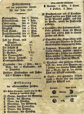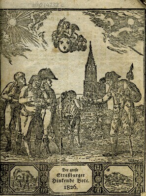 Kalender und Almanache waren bis zum 19. Jh. ein populäres Lektüremedium für breite Bevölkerungsschichten. In Straßburg wurden sogar mehrere dieser Kalender verlegt. Der große Straßburger Hinkende Bote erschien bei Le Roux. Wie einige andere Verleger in frankophonen Gebieten gab Le Roux mit dem Grand Messager boitteux de Strasbourg auch eine französische Ausgabe des Kalenders mit identischen, lediglich übersetzten Inhalten heraus. Wie für die Gattung der Volkskalender üblich, enthält der Große Straßburger Hinkende Bote einen Kalender nach verschiedenen Zeitrechnungen und so genannte astrologische Praktika (auf Astrologie beruhende Wettervorhersagen und Anweisungen), Termine für Messen und Märkte in der Region, Anekdoten, Platz für eigene Eintragungen, historische Begebenheiten und politische Neuigkeiten. Die Ausgabe von 1826 enthält außerdem zum Beispiel Karten zu den Schlachten bei Aspern und bei Wagram aus dem Fünften Koalitionskrieg und eine Genealogie des "rheinischen Bundes", womit der Rheinbund von 1806 gemeint ist. Auf dem Titelblatt des Straßburger Kalenders ist der namengebende "Hinkende Bote" abgebildet. Häufig waren es invalide Soldaten oder ausgediente Handlanger, die versuchten, sich als Kolporteure von Nachrichten und Geschichten oder als Verkäufer von Volkskalendern ein Auskommen zu sichern. Kalender mit "hinkenden Boten" im Titel waren vor allem im südwestdeutschen Raum, der Schweiz und dem Elsass verbreitet. [Johanna Kätzel]