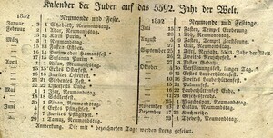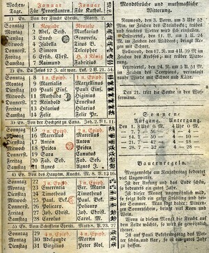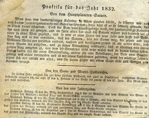 Auf dem Deckblatt steht ganz oben „Der Bote vom Haardtgebirge. Ein Kalender fürs Jahr. 1832. In der Mitte ist ein Stich des „Haardter Schloss“. 40 Blätter, gedruckt und verlegt von Philipp Christmann, Neustadt an der Haardt. Tabelle zu den verschiedenen Zeitrechnungssystemen (gregorianisch, jüdisch), Aufschlüsselung der verwendeten Symbole, Auflistung verschiedenster in der Vergangenheit liegender Ereignisse, Praktika für 1832, Finsternisse, Jahreszeiten. Kupferstich von Jozef Chlopicki. Józef Grzegorz Chłopicki (1771-1854) war ein polnischer General. Während des Novemberaufstands 1830 war er Oberbefehlshaber der polnischen Armee. Erzählung des Boten über "Polens Untergang und Wiedergeburt". Kupferstich Jan Skrzynecki. Jan Zygmunt Skrzynecki (1786-1860) war ein polnischer General. Er war Oberfeldherr während des Novemberaufstands 1830. Kupferstich zu Friedrich d. Große und die Jesuiten. Der Jesuitenorden wurde am 21. Juli 1773 durch Papst Clemens XIV. aufgehoben. Die Regierungen Preußens und auch Russlands waren nicht katholisch und boten den Jesuiten eine Fluchtmöglichkeit an. Kupferstich zu: Der Herr Wunderlich.