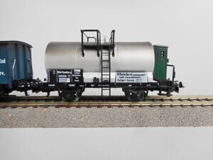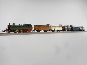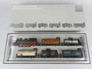 Märklin 2857 Zugpackung: "Württembergischer Zug. Güterzug der Königlich Württembergischen Staats-Eisenbahnen. Einmalige Sonderserie zum 125jährigen Märklin-Jubiläum" 1984 Der Zug stellt einen kurzen Güterzug in der Zeit vor dem ersten Weltkrieg dar. Lok und Waggons sind werksseitig gealtert, d.h. im oberen Bereich mit duklem Farbnebel wurde Betriebsverschmutzung dargestellt. Tender-Dampflok Gattung T5 Betriebs-Nr. 1205 Tender-Dampflok mit 3 Kuppelachsen, je 1 Vor- und Nachlauf-Achse, Bauart 1´C 1´ h2 Kessel, Wasserkästen und Führerhaus grün mit schwarz-goldener Beschriftung, Rauchkammer und Dach schwarz, Räder und Fahrgestell rot. Antrieb im Führerhaus, 3 Achsen angetrieben. Gehäuse der Lok aus Kunststoff. Je 2 beleuchtete Stirnlampen beidseitig. Radkränze und Gestänge vernickeltes Metall. Beidseitig Standard-Bügelkupplungen. Wagen: Gedeckter Kühl-Güterwagen "Württember 600088" Beschriftet "Märklin" im Stil um 1895. Wagenkasten orange, Dach dunkelgrau mit doppeltem Dachblech. Fahrgestell schwarz mit weißer Beschriftung. Bierkühlwagen mit Bremserhaus "Württemberg 600085" der Vereinigten Brauereien Stuttgart Tübingen". Wagenkasten weiß mit bunter Beschriftung, Dach dunkelgrau mit doppeltem Dachblech, Fahrgestell schwarz mit durchgehenden Trittbrettern. Kesselwagen "Württemberg 502288" der Fa. "2Zeller & Gmelin, Mineralöl-Raffinerie, Eislingen an der Fils". Kessel grau mit bunter Beschriftung, Bremserhaus braun. Fahrgestell schwarz mit weißer Beschriftung. Bierkühlwagen Betr. Nr. 600527 "Staufen Bräu" der "Brauerei zum Rad, J.Rau, Göppingen". Hölzerner Wagenkasten blau mit bunter Beschriftung, hochstehendes Bremserhaus, Dach dunkelgrau mit doppeltem Dachblech. Kesselwagen "Württemberg 502208" der Fa. "Wilhelm Burk AG, Stuttgart Korntal". Kessel grausilber, Bremserhaus rotbraun, Fahrgestell schwarz mit weißer Beschriftung. Alle Waggons mit Speichenrädern. Standard-Bügelkupplungen. Original-Verpackung aus Karton mit Kunststoff-Einsatz. 2-Leiter Gleichstrom-System analog. Epoche 1 (Länderbahn-Zeit 1835 - 1920)