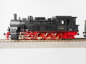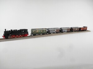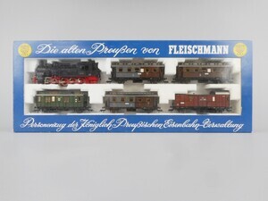 Zugpackung: Personen-Zug der Königlich Preußischen Eisenbahn Verwaltung. Sonderserie. Der Zug stellt einen Personen-Zug um 1910 dar. Tenderlok Baureihe 94 mit 3 2-achsigen Personenwagen, Postwagen, und 3-achsigem Gepäckwagen. Lok in der Reichsbahn-Version, ursprünglich war eine grün lackierte Tender-Dampflok Gattung T 16 der Preußischen Eisenbahn Verwaltung in der Packung. Betriebs-Nr. "94 895" der Deutschen Reichsbahn Gesellschaft. Dampflok mit 5 Kuppelachsen (Preuß. Bauart T 16). Kessel, Wasserkästen und Führerhaus schwarz mit nachträglich angebrachter Messing-Beschriftung (Kleinserien-Ätzteile), Räder und Fahrgestell rot. Antrieb im Führerhaus, 5 Achsen angetrieben. Gehäuse der Lok aus Kunststoff. Beidseitig beleuchtete Stirnlampen. Radkränze und Gestänge vernickeltes Metall. Keine Kupplung montiert. Alle Wagen (außer Pw) haben durchgehenden Oberlicht-Dachaufbau in grausilber, und Speichenräder. Ausgestattet mit "Fleischmann Profi-Kupplungen". Postwagen "2678" der Kaiserlich Deutschen Post. Wagenkasten grün mit bunter Beschriftung. Durchgehende Trittbretter am Fahrgestell. Personenwagen 3./4. Klasse "2522" dunkelbraun/grauer Wagenkasten mit bunter Beschriftung. Einseitig Einstiegsbühne auf der 4. Klasse Seite. Personenwagen 3./4. Klasse "2532" Wagenkasten dunkelbraun/grau mit bunter Beschriftung. Beidseitig Einstiegsbühnen. Personenwagen 3. Klasse "2361" Wagenkasten dunkelbraun mit bunter Beschriftung. Beidseitig geschlossene Einstiegbereiche. Gepäckwagen 3-achsig "Erfurt 3120" Wagenkasten rotbraun mit weißer Beschriftung, Zugführerkanzel auf dem Dach und 2 bewegliche Schiebetüren. Durchgehende Trittbretter am Fahrgestell. Original-Verpackung aus Karton mit Kunststoff-Einsatz. 2-Leiter Gleichstrom-System analog. Epoche 1 (Länderbahn-Zeit 1835 - 1920)