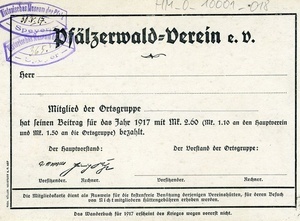 Mitgliedskarte Pfälzerwald-Verein; Vorderseite: "Wald-Heil 1917" Druckgraphik: Verwundeter Soldat und Frau in schlichter Arbeitskleidung (Schwester?) auf einer Bank vor Naturkulisse; Rückseite: Pfälzerwald-Verein e.V. Herr (...) Mitglied der Ortsgruppe (...) hat seinen Beitrag für das Jahr 1917 mit Mk. 2.60 (Mk. 1.10 an den Hauptverein und Mk. 1.50 an die Ortsgruppe) bezahlt. Der Hauptvorstand: Der Vorstand der Ortsgruppe: (...). Die Mitgliedskarte dient als Ausweis für die kostenfreie Benützung derjenigen Vereinshütten, für deren Besuch von N i c h t mitgliedern Hüttengebühren erhoben werden. Das Wanderbuch für 1917 erscheint des Krieges wegen vorerst nicht.; Herausgeber: "Rich. Müller, Neustadt a.d. Hdt"