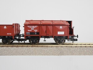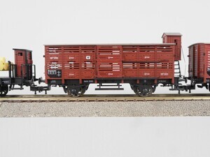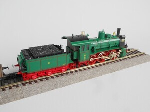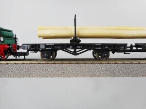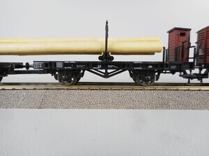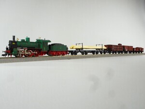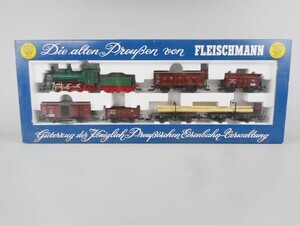 Zugpackung: Personen-Zug der Königlich Preußischen Eisenbahn Verwaltung. Sonderserie. Der Zug stellt einen kurzen Güter-Zug um 1910 dar. Schlepptenderlok G4.3 mit 6 2-achsigen Güterwagen, davon eine festgekuppelte Drehschemelwagen-Einheit mit Langholzladung. Kleine Schlepp-Tender-Dampflok Gattung G 4.3 der Preußischen Eisenbahn Verwaltung. Betriebs-Nr. "3915 Danzig". Dampflok mit 3 Kuppelachsen und 3-achsigem Schlepptender. Kessel, Tender und Führerhaus grün mit gelber Beschriftung und roten Zierlinien, Räder und Fahrgestell rot. Antrieb im Führerhaus, 3 Achsen angetrieben. Gehäuse der Lok aus Kunststoff. An der Lok beleuchtete Stirnlampen. Radkränze und Gestänge vernickeltes Metall. Fleischmann Profi-Kupplung beidseitig. Alle Wagen haben schwarze Fahrgestelle mit weißer Beschriftung und Speichenräder. Ausgestattet mit "Fleischmann Profi-Kupplungen". Davon nur 2 kurze Wagen mit Kurzkupplungs-Kinematik (KKK) Eiserner Klappdeckelwagen Gattung Km mit Bremserhaus, Brt.Nr. "Stettin 17213". Aufbau rotbraun mit weißer Beschriftung. Mit 6 beweglichen Klappdeckeln. KKK. Offener eiserner Güterwagen Gattung Omk, Betr.Nr. "Magdeburg 54713". Wagenaufbau rotbraun mit weißer Beschriftung. KKK. Gedeckter Güterwagen Gattung Nm, Betr.Nr. "Halle 15833". Wagenkasten rotbraun mit weißer Beschriftung, Dach braungrau. Kleinvieh-Verschlagwagen Gattung Venmz, Betr.Nr. "Stettin 16835". Aufbau rotbraun mt weißer Beschriftung, Dach grau. Drehschemelwagen ohne Bremserhaus, Gt. Hmlzr, Betr. Nr. Magdeburg 100105 gekuppelt mit Drehschemelwagen mit Bremserhaus, Gt. Hmlzr, Betr. Nr. Magdeburg 100126. Ladefläche braun. Mit 5 Langholzstämmen als Ladung. Original-Verpackung aus Karton mit Kunststoff-Einsatz. 2-Leiter Gleichstrom-System analog. Epoche 1 (Länderbahn-Zeit 1835 - 1920)