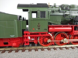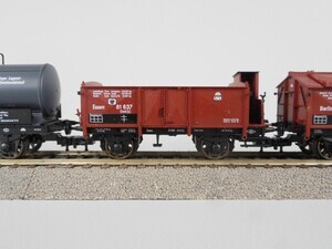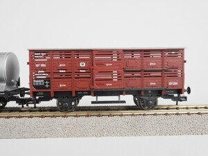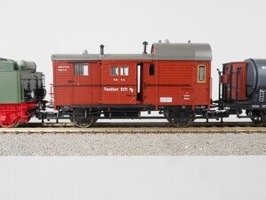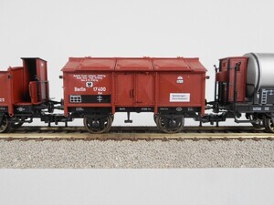 Fleischmann 4884 Zugpackung: Personen-Zug der Preußischen Eisenbahn Verwaltung. Sonderserie. Der Zug stellt einen kurzen Güter-Zug um 1920 dar. Schlepptenderlok G 8.2 mit 5 2-achsigen Güterwagen und Güterzug-Begleitwagen. Schlepp-Tender-Dampflok Gattung G 8.2 der Königlich Preußischen Eisenbahn Verwaltung. Betriebs-Nr. "5353 ". Dampflok mit 4 Kuppelachsen, 1 Vorlaufachse und 3-achsigem Schlepptender. Kessel, Tender und Führerhaus grün mit gold-schwarzer Beschriftung, Rauchkammer schwarz, Räder und Fahrgestell rot. Antrieb im Tender, 3 Achsen angetrieben. Gehäuse der Lok aus Kunststoff. Beidseitig beleuchtete Stirnlampen. Radkränze und Gestänge vernickeltes Metall. Fleischmann Profi-Kupplung beidseitig. Alle Wagen haben schwarze Fahrgestelle mit weißer Beschriftung und Speichenräder. Ausgestattet mit "Fleischmann Profi-Kupplungen" und Kurzkupplungs-Kinematik (KKK). Güterzug-Begleitwagen Pg Betr.Nr. "Frankfurt 5171". Wagenkasten rotbraun mit 2 beweglichen Schiebetüren, Dach grau mit Zugführer-Kanzel. Fahrgestell mit durchgehenden Trittbrettern. Offener eiserner Güterwagen Gattung Omk(u), Betr.Nr. "Essen 81637". Wagenaufbau rotbraun mit weißer Beschriftung. Eiserner Klappdeckelwagen Gattung Km, Betr.Nr. "Berlin 17400" Aufbau rotbraun mit weißer Beschriftung, 6 bewegliche Klappdeckel. Kleinvieh-Verschlagwagen Gattung Venmz Betr.Nr. "Stettin 16944". Aufbau rotbraun mit 2 beweglichen Schiebetüren, Dach hellgrau. Kesselwagen mit Bremserhaus der Fa. "A.May, Mineralöl-Transporte" Betr.Nr. "Erfurt 502231". Kessel grau mit schwarzer Beschriftung, Bremserhaus rotbraun. Kesselwagen mit Bremserhaus "D.A.P.G." Betr.Nr. "Altona 502394". Kessel grausilber mit bunter Beschriftung, Bremserhaus rotbraun. Original-Verpackung aus Karton mit Kunststoff-Einsatz und Betriebsanleitung. 2-Leiter Gleichstrom-System analog. Epoche 1- 2 (Übergang Länderbahn- zu Staatsbahn-Zeit um 1920)