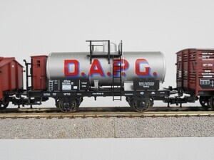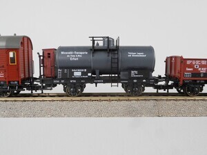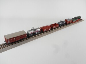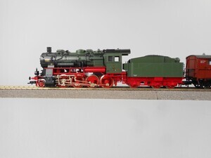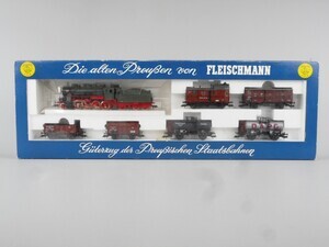 Fleischmann 4884 Zugpackung: Personen-Zug der Preußischen Eisenbahn Verwaltung. Sonderserie. Der Zug stellt einen kurzen Güter-Zug um 1920 dar. Schlepptenderlok G 8.2 mit 5 2-achsigen Güterwagen und Güterzug-Begleitwagen. Schlepp-Tender-Dampflok Gattung G 8.2 der Königlich Preußischen Eisenbahn Verwaltung. Betriebs-Nr. "5353 ". Dampflok mit 4 Kuppelachsen, 1 Vorlaufachse und 3-achsigem Schlepptender. Kessel, Tender und Führerhaus grün mit gold-schwarzer Beschriftung, Rauchkammer schwarz, Räder und Fahrgestell rot. Antrieb im Tender, 3 Achsen angetrieben. Gehäuse der Lok aus Kunststoff. Beidseitig beleuchtete Stirnlampen. Radkränze und Gestänge vernickeltes Metall. Fleischmann Profi-Kupplung beidseitig. Alle Wagen haben schwarze Fahrgestelle mit weißer Beschriftung und Speichenräder. Ausgestattet mit "Fleischmann Profi-Kupplungen" und Kurzkupplungs-Kinematik (KKK). Güterzug-Begleitwagen Pg Betr.Nr. "Frankfurt 5171". Wagenkasten rotbraun mit 2 beweglichen Schiebetüren, Dach grau mit Zugführer-Kanzel. Fahrgestell mit durchgehenden Trittbrettern. Offener eiserner Güterwagen Gattung Omk(u), Betr.Nr. "Essen 81637". Wagenaufbau rotbraun mit weißer Beschriftung. Eiserner Klappdeckelwagen Gattung Km, Betr.Nr. "Berlin 17400" Aufbau rotbraun mit weißer Beschriftung, 6 bewegliche Klappdeckel. Kleinvieh-Verschlagwagen Gattung Venmz Betr.Nr. "Stettin 16944". Aufbau rotbraun mit 2 beweglichen Schiebetüren, Dach hellgrau. Kesselwagen mit Bremserhaus der Fa. "A.May, Mineralöl-Transporte" Betr.Nr. "Erfurt 502231". Kessel grau mit schwarzer Beschriftung, Bremserhaus rotbraun. Kesselwagen mit Bremserhaus "D.A.P.G." Betr.Nr. "Altona 502394". Kessel grausilber mit bunter Beschriftung, Bremserhaus rotbraun. Original-Verpackung aus Karton mit Kunststoff-Einsatz und Betriebsanleitung. 2-Leiter Gleichstrom-System analog. Epoche 1- 2 (Übergang Länderbahn- zu Staatsbahn-Zeit um 1920)