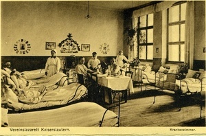 Postkarte ist Bestandteil eines Erinnerungsalbums mit 12 Fotopostkarten. Auf der Vorderseite: Vereinslazarett Kaiserslautern, Krankenzimmer.