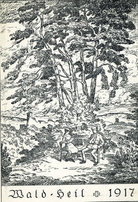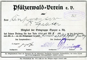 Mitgliedskarte Pfälzerwald-Verein; Vorderseite: "Wald-Heil 1916" Reproduktion des Gemäldes eines Soldaten , der sich auf einem Mauerring aus Natursteinquadern abstützt und nach unten schaut, Handschuhe und aufgestellter Kragen des Mannes sowie die bewegte Dämmerung im Hintergrund lassen eine Nachtwache im Wald vermuten. Rückseite: Pfälzerwald-Verein e.V. Herr (...) Mitglied der Ortsgruppe Speyer a. Rh. hat seinen Beitrag für das Jahr 1916 mit Mk. 1 (Mk. 1. an den Hauptverein) bezahlt, ferner M. 1.50 f. Pfw. Zeitg. Der Hauptvorstand: Der Vorstand der Ortsgruppe: (...). Die Mitgliedskarte dient als Ausweis für die kostenfreie Benützung derjenigen Vereinshütten, für deren Besuch von N i c h t mitgliedern Hüttengebühren erhoben werden. Das Wanderbuch für 1916 erscheint des Krieges wegen vorerst nicht.