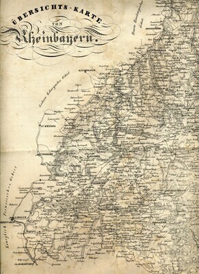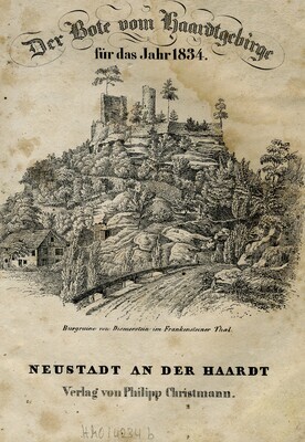Auf dem Deckblatt ist ein Stich der „Burgruine von Diemerstein im Frankensteiner Thal“ zu sehen. Oberhalb des Stichs der Titel in zwei verschiedenen Schriftarten: „Der Bote vom Haardtgebirge für das Jahr 1834.“ 42 Blätter, gedruckt und verlegt von Philipp Christmann, Neustadt an der Haardt. Tabelle zu den verschiedenen Zeitrechnungsarten (gregorianisch, jüdisch), Aufschlüsselung der verwendeten Symbole, Auflistung verschiedenster in der Vergangenheit liegender Ereignisse, Praktika für 1834, Finsternisse, Jahreszeiten, Ratschläge zur Gartenarbeit und Leerblätter für persönliche Notizen. Ausschnitt der Übersichtskarte von „Rheinbayern“. Erzählungen und Beschreibungen: Eisenbahnen und Dampfwagen. Stich: Eisenbahn zwischen Liverpool und Manchester. Kupferstich zu "Gleiches mit Gleichem". Kupferstich von Benjamin Franklin: Benjamin Franklin (1706-1790) war einer der Gründerväter der Vereinigten Staaten von Amerika, Drucker, Verleger, Schriftsteller, Naturwissenschaftler und Erfinder. Rechenaufgaben.