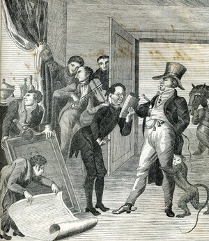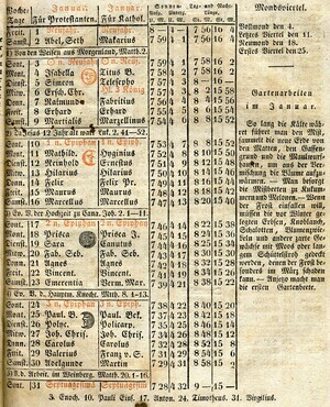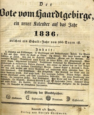 Auf dem Deckblatt ist eine Titelvignette des „Trifels“ zu sehen. Oberhalb des Stichs der Name des Kalenders in zwei verschiedenen Schriftarten: „Der Bote vom Haardtgebirge für das Jahr 1836.“ 42 Blätter, gedruckt und verlegt von Philipp Christmann, Neustadt an der Haardt. Tabelle zu den verschiedenen Zeitrechnungssystemen (gregorianisch, jüdisch), Aufschlüsselung der verwendeten Symbole, Auflistung verschiedenster in der Vergangenheit liegender Ereignisse, Praktika für 1836, Finsternisse, Jahreszeiten, Ratschläge zur Gartenarbeit, Leerseiten für persönliche Eintragungen. Karte des Rheins von Frankenthal bis Wesel. Erzählungen: hier zur Titelvignette passend geht es um den Trifels. 3 Kupferstiche. Übersicht und Beurteilung der Weinjahre im 16. Jahrhundert.