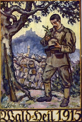 Mitgliedskarte Pfälzerwald-Verein; Vorderseite: "Wald-Heil 1915" Reproduktion eines Gemäldes. Ein Soldat hat sich aus den marschierenden Reihen abgesetzt, sein Gewehr an einen Baum gelehnt und steckt sich einen Eichenzweig an den Helm. Rückseite: "Pfälzerwald-Verein e.V. Herr (...) Mitglied der Ortsgruppe Herxheim hat seinen Beitrag für das Jahr 1915 mit Mk. 2,60 (Mk. 1.10 an den Hauptverein und Mk. 1.50 an die Ortsgruppe) bezahlt. Der Hauptvorstand: Der Vorstand der Ortsgruppe: (...). Die Mitgliedskarte dient als Ausweis für die kostenfreie Benützung derjenigen Vereinshütten, für deren Besuch von N i c h t mitgliedern Hüttengebühren erhoben werden. Das Wanderbuch für 1915 erscheint später als Ehrenbuch für unsere am Kriege beteiligten Mitglieder."