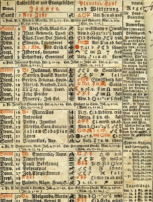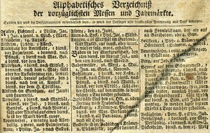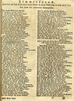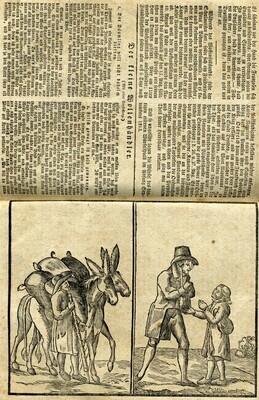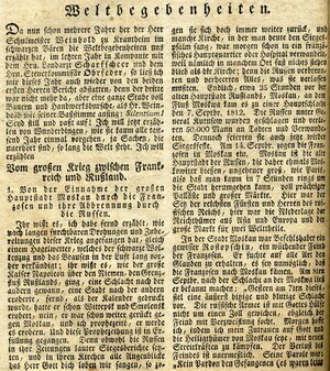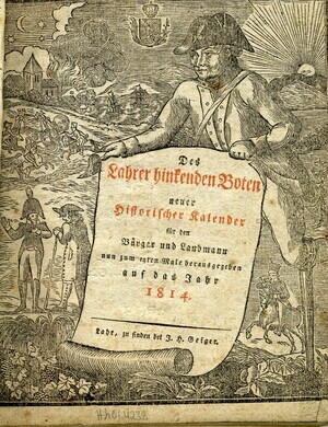 Kalender und Almanache waren bis zum 19. Jh. ein populäres Lektüremedium für breite Bevölkerungsschichten. Der Lahrer Hinkende Bote, verlegt von Johann Heinrich Geiger, erschien erstmals 1801 und ist damit einer der jüngsten Kalender in dieser Region. Wie für die Gattung der Volkskalender üblich, enthält der Lahrer Hinkende Bote einen Kalender nach verschiedenen Zeitrechnungen und so genannte astrologische Praktica (auf Astrologie beruhende Wettervorhersagen), Termine für Messen und Märkte in der Region, "merkwürdige" Anekdoten und erbauliche Erzählungen, Berichte über historische Begebenheiten und interessante politische Neuigkeiten. Die Ausgabe von 1814 enthält unter anderem eine Karte des Großherzogtums Baden und den Stammbaum des Großherzoglichen Badischen Hauses sowie, als "Weltbegebenheiten", Nachrichten über den Krieg zwischen Frankreich und Russland. Auf dem Titelblatt des Lahrer Kalenders ist der namengebende "Hinkende Bote" abgebildet: ein Mann mit Holzbein in Soldatenuniform. Tatsächlich waren es häufig invalide Soldaten, die versuchten, sich als Kolporteure von Nachrichten und Geschichten oder als Verkäufer von Volkskalendern ein Auskommen zu sichern. Die "hinkenden Boten" wurden in den Kalendern oftmals nicht nur visuell dargestellt, sondern auch textuell, indem sie darin als Erzähler auftreten. Kalender mit "hinkenden Boten" im Titel waren vor allem im südwestdeutschen Raum, der Schweiz und dem Elsass verbreitet. [Johanna Kätzel]