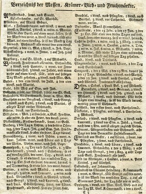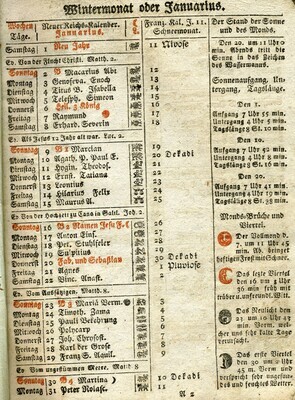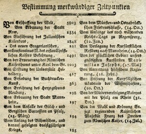 Tabelle zu den verschiedenen Zeitrechnungsarten (gregorianisch, jüdisch), Aufschlüsselung der verwendeten Symbole, Auflistung verschiedenster in der Vergangenheit liegender Ereignisse, Praktika für 1814, Finsternisse, Jahreszeiten, Ratschläge zur Gartenarbeit und Leerseiten für persönliche Eintragungen. 28 Blätter, gedruckt und verlegt in der Kurfürstlichen-, Hof- und Akademie- Buchdruckerei Mannheim. Auf dem Deckblatt der Titel in rot und schwarz: „Privilegirter Kurfürstl. Rheinpfälzischer Landwirtschaft- und Geschichts-Kalender auf das Jahr Christi 1803.“. Bericht über den "hohe[n] Werth des Gassenkothes und der thierischen Auswürfe. (Aus den Blättern für Polizei und Kultur.)" Verzeichnis der Messen und Jahrmärkte.