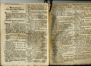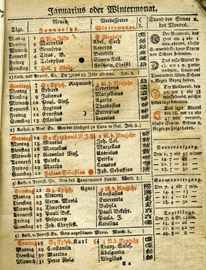 Der volkstümliche Kalender enthält Seiten für jeden Monat, zweifarbiges Deckblatt, die Bestimmung merkwürdiger Zeitpunkte, Sonnen- bzw. Mond-Finsternisse im Jahr, Jüdische Kalender, Mondphasen, Erzählungen, Landwirtschaftliche Notizen und Leerseiten für persönliche Eintragungen. 28 Blätter, gedruckt und verlegt von der Mohr- und Zimmerschen Buchhandlung in Heidelberg und der Bürgerhofspitals- Buchdruckerei in Mannheim. Erzählung von einem wilden Hunde. Schlacht bei Aspern. Schlacht bei Wagram. Genealogie der Regentenfamilien des Rheinischen Bundes.