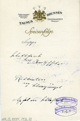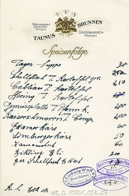 Menükarte des Hotels "Schwan" in Kaiserslautern - Inhaber Ludwig Wolf. Werbeaufdruck "Taunus-Brunnen. Grosskarben, Hessen"; Vorderseite: "Tagessuppe 30 - Ente mit Salat - 3,00 - Lendenstück m. Salat 2,50 - Wiener Schnitzel 2,50 - Paprikaschnitzel 2,50 - Cablian m. Kartoffeln 2,70 - Schellfisch m. Kartoffeln 2,60 - Schweizer Käse 60 - Camembert 59" - Kaiserslautern, 23. Oktober 1916