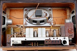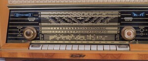 Ein selteneres Stück. Allenfalls diejenigen, die noch Erinnerungen an die 60er Jahre haben, erinnern sich an den Namen „Kuba“. Ursprünglich stellte die Firma aus Wolfenbüttel, Gehäuse für Tonmöbel her, die anschließend mit Produkten namhafter Hersteller wie Philips, Grundig Graetz etc. ausgestattet wurden Ende der 50er Jahre wurde die insolvente „Continental-Rundfunk GmbH“ aus Osterode/Harz samt dem Markennamen „Imperial“ übernommen, was zu dem Doppelnamen Kuba-Imperial führte . Außerdem war Kuba nun nicht mehr auf externe Hersteller angewiesen, sondern entwickelte und produzierte selbst. Unser Gerät führt nur den Namen Kuba und wurde wohl vor der Einführung des Doppelnamens Kuba-Imperial hergestellt. Die Frontseite bietet die klassische Einteilung. Im oberen Bereich, die Lautsprecher, darunter die Senderskala mit allen Bedienelementen. Mit insgesamt 12 Drucktasten werden nicht nur die Wellenbereiche LW/KW/MW/UKW gewählt, sondern auch eine Klangverstärkung für "Orchester", "Solo", und "Bass". Zusätzlich noch „Aus“ und externe Geräte wie Phono/ Tonband. Für den Stereo Eindruck sorgen der Hauptlautsprecher, sowie zwei Kleinere, die rechts und links, seitlich verbaut sind.