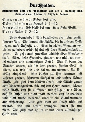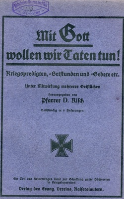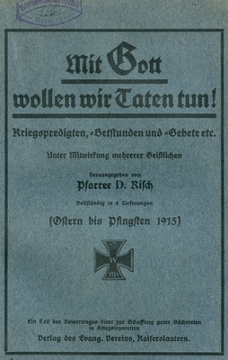 Mit Gott wollen wir Taten tun! Kriegspredigten, -betstunden und -gebete unter Mitwirkung mehrerer Geistlichen, herausgegeben von Pfarrer D. Risch. Vollständig in 8 Lieferungen. Ein Teil des Reinertrages dient zur Schaffung guter Büchereien in Kriegslazaretten.; Verlag des Evang. Vereins, Kaiserslautern; Druck von Emil Rohr, Buchdruckerei- u. Verlagsgesellschaft m.b.H. Kaiserslautern