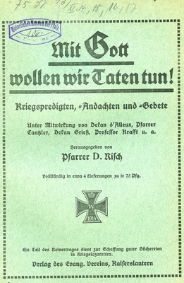 Mit Gott wollen wir Taten tun! Kriegspredigten, -betstunden und -gebete unter Mitwirkung von Dekan d’Alleux, Pfarrer Cantzler, Dekan Grieß, Professor Krafft u.a., herausgegeben von Pfarrer D. Risch. Vollständig in etwa 4 Lieferungen zu je 75 Pfg. Ein Teil des Reingewins dient zur Schaffung guter Büchereien in Kriegslazaretten.; Verlag des Evang. Vereins, Kaiserslautern; Druck von Emil Rohr, Buchdruckerei- u. Verlagsgesellschaft m.b.H. Kaiserslautern
