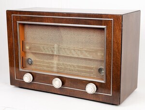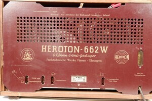 Die Firma Funktechnische Werke in Füssen - kurz FWF genannt - bauten nicht sehr viele Radios. Unser Empfänger, der FWF - Typ Heroton 662 W wurde von 1950 bis 1951 produziert. Weder technisch noch optisch hatte das Radio etwas Besonderes zu bieten. Ausgestattet mit den Wellenbereichen MW/LW und KW, die mit mehreren Bändern. UKW ist lediglich „vorbereitet“. Auffällig ist die Senderskala. Sie besteht aus neutralem Glas auf das die Stationen in einem Eierschalenton aufgedruckt sind. Die Glasscheibe ist horizontal zwei geteilt. Die obere Scheibe ist den Lang und Mittelwelle Stationen vorbehalten, die Untere den Kurzwellensendern. Mit dem rechten Drehschalter gelingt, mit kräftigem Druck, die Einstellung der Wellenbereiche. Mit dem mittleren Drehknopf erfolgt die Senderwahl und mit dem Linken Ein/Aus und –Laut/Leise. Rückseitige sind Anschlüsse für Platte und Tonband sowie Antenne, Erde und Zweitlautsprecher eingebaut. Im Geschäft kostete der Apparat 335 DM.