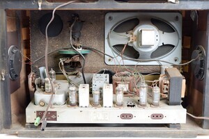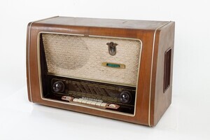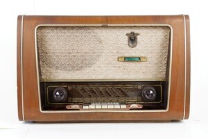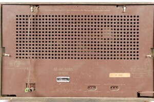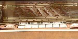 Die Firma Krefft, eigentlich eine Küchengerätefabrik, begann 1949 mit einer Radioproduktion. Unser Gerät, der Weltfunk W 558, wurde 1954/1955 hergestellt. Er dürfte wohl der letzte produzierte Typ gewesen sein, da 1955 die Radio Produktion bereits wieder eingestellt wurde. Das Gehäuse ist aus Holz, mittelbraun furniert. Der Aufbau ist klassisch. In die Stoffabdeckung des Lautsprechers ist ein Magisches Auge integriert, umrahmt von dem Logo der Marke „Weltfunk“ (Bild). Mit den Drucktasten werden die Wellenbereiche KW/MW/LW und UKW gesteuert sowie der Tonabnehmer und das Ausschalten des Radios. Eine nette Besonderheit gibt es noch. Die gewählte Einstellung der Höhen und Bässe ist an der dargestellten Klaviertastatur zu erkennen. Rückseitig können ein Plattenspieler und Zweitlautsprecher über Bananenstecker angeschlossen werden. Ebenso Antenne und Erde. Der Preis im Radiofachgeschäft lag bei 328 DM.