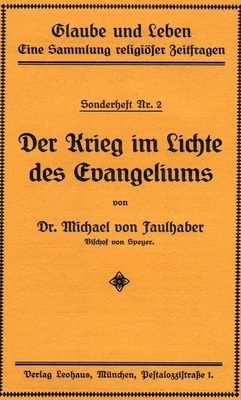 Glaube und Leben. Eine Sammlung religiöser Zeitfragen, Sonderheft Nr. 2, Der Krieg im Lichte des Evangeliums, von Dr. Michael von Faulhaber, Bischof von Speyer.; Verlag Leohaus, München, Pestalozzistraße 1, Druck von Franz X. Seitz in München