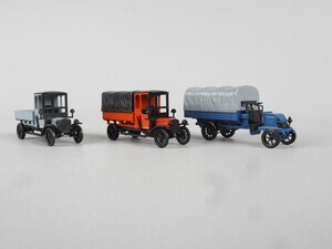 Märklin 1899 3 Lastwagenmodelle nach Vorbildern aus der Frühzeit der Automobile: Gaggenau Pritschenwagen mit schwarzer Plane, Aufbau orange. Gaggenau Pritschenwagen ohne Plane, Aufbau hellgrau Büssing Pritschenwagen, mit offenem Fahrersitz, Aufbau blau. Gefertigt aus Metallspritzguss mit Kunststoffteilen. In originaler Verpackung. Maßstab 1:87 (Baugröße H0). Epoche 1
