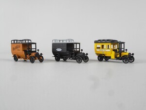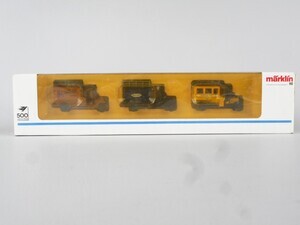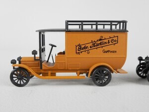 Märklin 1898 Sonderserie zum Jubiläum "500 Jahre Post" 3 Lastwagenmodelle nach Vorbildern aus der Frühzeit der Automobile: Gaggenau Kastenwagen "Märklin", Aufbau orange mit schwarzer Beschriftung. Dach und Fahrgestell schwarz. Gaggenau Kastenwagen "K.Württ.Post", Fahrgestell, Dach und Aufbau schwarz mit weißer Beschriftung. Gaggenau Postbus "Kaiserliche Post", Aufbau gelb mit schwarz-weißer Beschriftung, Dach und Fahrgestell schwarz. Gefertigt aus Metallspritzguss mit Kunststoffteilen. In originaler Verpackung. Beiliegend Faltblatt mit Werbung zu den Sondermodellen zu "500 Jahre Post" von Märklin. Maßstab 1:87 (Baugröße H0). Epoche 1