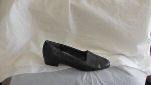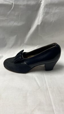 Ein einzelner Pumps aus schwarzem Leder. Spitze Form, mit Leder bezogener und metallgenagelter Absatz (ca. 8cm). Der Schuh verfügt über Zierlochungen und Zierflechtungen. Hergestellt von der Firma Boa in Deutschland. Datiert auf 1935. Dieser Schuh wurde dem Vorbesitzer vom Schuhmuseum in Weißenfels geschenkt.