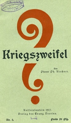 "Kriegszweifel, von Pfarrer Ph. Kirchner, Kaiserslautern 1917 (Erbauliche Volksschriften des Evang. Vereins für die Pfalz, Nr. 3 - 4), Nr. 3 Preis 20 Pfg. Nr. 1 und 2 der Erbaulichen Volksschriften des Evang. Vereins für die Pfalz im gleichen Verlag erschienen von demselben Verfasser: Der neue Geist. - Der Durchbrecher und der Durchbruch, je 10 Pfg.", 24 Seiten; Verlag des Evang. Vereins, Kaiserslautern 1917 Die Schrift stellt sich eindeutig auf die Seite der Kriegsbeführworter und argumentiert, warum evangelische Christen den Krieg bejahen sollen.