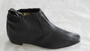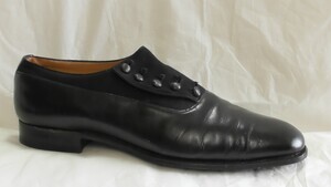 Ein einzelner Damen-Spangenschuh aus schwarzem Leder. Spitze Form, lackierter und metallgenagelter Absatz (ca. 5,5cm), ein Riemen mit Knopf dient der Befestigung. Der Schuh verfügt über Zierflechtungen. Datiert auf 1936. Dieser Schuh wurde dem Vorbesitzer vom Schuhmuseum Weißenfels geschenkt.