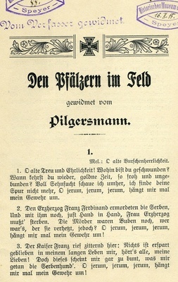 "Den Pfälzern im Feld, gewidmet vom Pilgersmann" (1915), 8 Seiten, gefaltet.