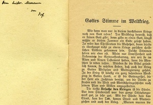"Gottes Stimme im Weltkrieg. Vortrag für denkende Leute im Feld und in der Heimat. Von Pfarrer Schmidt, Niederkirchen i. Ostertal (Pfalz), ca. 1915. Preis 20 Pfg.", 32 Seiten; Innen handschriftl.: "Dem histor. Museum vom Verf."; Verlag Georg Hornberger, Waldfischbach (Pfalz)