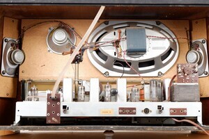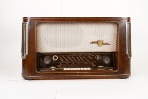 Den Namen TEKADE verbinden wir heute eher mit Telefonen denn mit Radios. Dennoch wurden schon vor dem Krieg von der Firma Radios produziert. Unser Gerät, Typ „Weltakkord W 688“ stammt aus dem Jahr 1956. Die Ausmasse sind mit 74 cm in der Breite beachtlich. Die seitlich Ecken sind abgerundet, dahinter verbergen sich zusätzliche Lautsprecher. Das Gehäuse ist in dunklem Ton, hochglanz lackiert. Über Drucktasten werden die Wellenbereiche LW/MW/KW/UKW, mit Drehknöpfen erfolgt die Abstimmung der Sender sowie die Lautstärke. Rückseitig sind Anschlüsse für Plattenspieler (Bananenstecker) und Tonband (Dioden Stecker) eingebaut. Der Erwerb dieses Radios war 1956 eine kostspielige Angelegenheit. Der Preis lag bei 458 DM