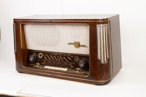 Den Namen TEKADE verbinden wir heute eher mit Telefonen denn mit Radios. Dennoch wurden schon vor dem Krieg von der Firma Radios produziert. Unser Gerät, Typ „Weltakkord W 688“ stammt aus dem Jahr 1956. Die Ausmasse sind mit 74 cm in der Breite beachtlich. Die seitlich Ecken sind abgerundet, dahinter verbergen sich zusätzliche Lautsprecher. Das Gehäuse ist in dunklem Ton, hochglanz lackiert. Über Drucktasten werden die Wellenbereiche LW/MW/KW/UKW, mit Drehknöpfen erfolgt die Abstimmung der Sender sowie die Lautstärke. Rückseitig sind Anschlüsse für Plattenspieler (Bananenstecker) und Tonband (Dioden Stecker) eingebaut. Der Erwerb dieses Radios war 1956 eine kostspielige Angelegenheit. Der Preis lag bei 458 DM